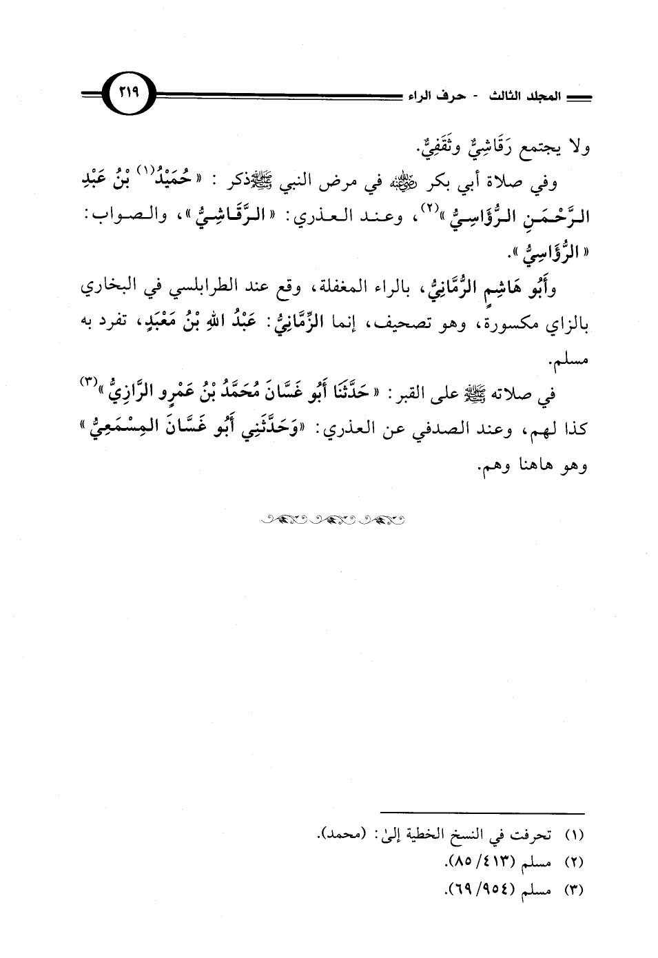 وأَبُو هَاشِمٍ الرُّمَّانِيُّ، بالراء المغفلة، وقع عند الطرابلسي في البخاري بالزاي مكسورة، وهو تصحيف، إنما الزِّمَّانِيُّ: عَبْدُ اللهِ بْنُ مَعْبَدٍ، تفرد به مسلم.