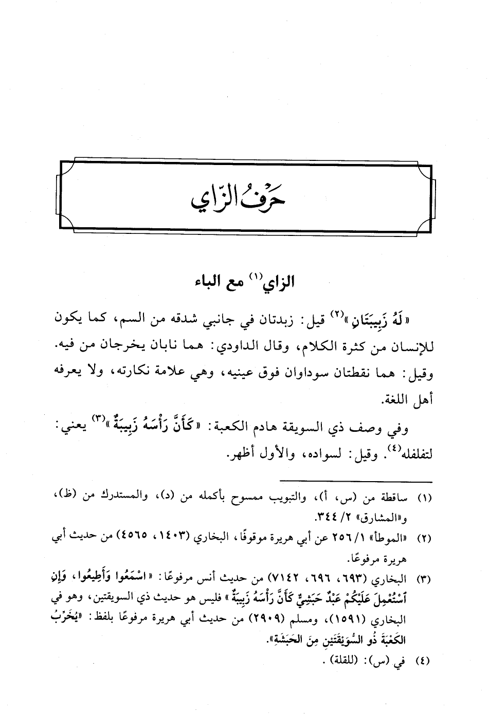 وفي وصف ذي السويقة هادم الكعبة: "كَأَنَّ رَأْسهُ زَبِيبَةٌ" (¬3) يعني: لتفلفله (¬4). وقيل: لسواده، والأول أظهر.