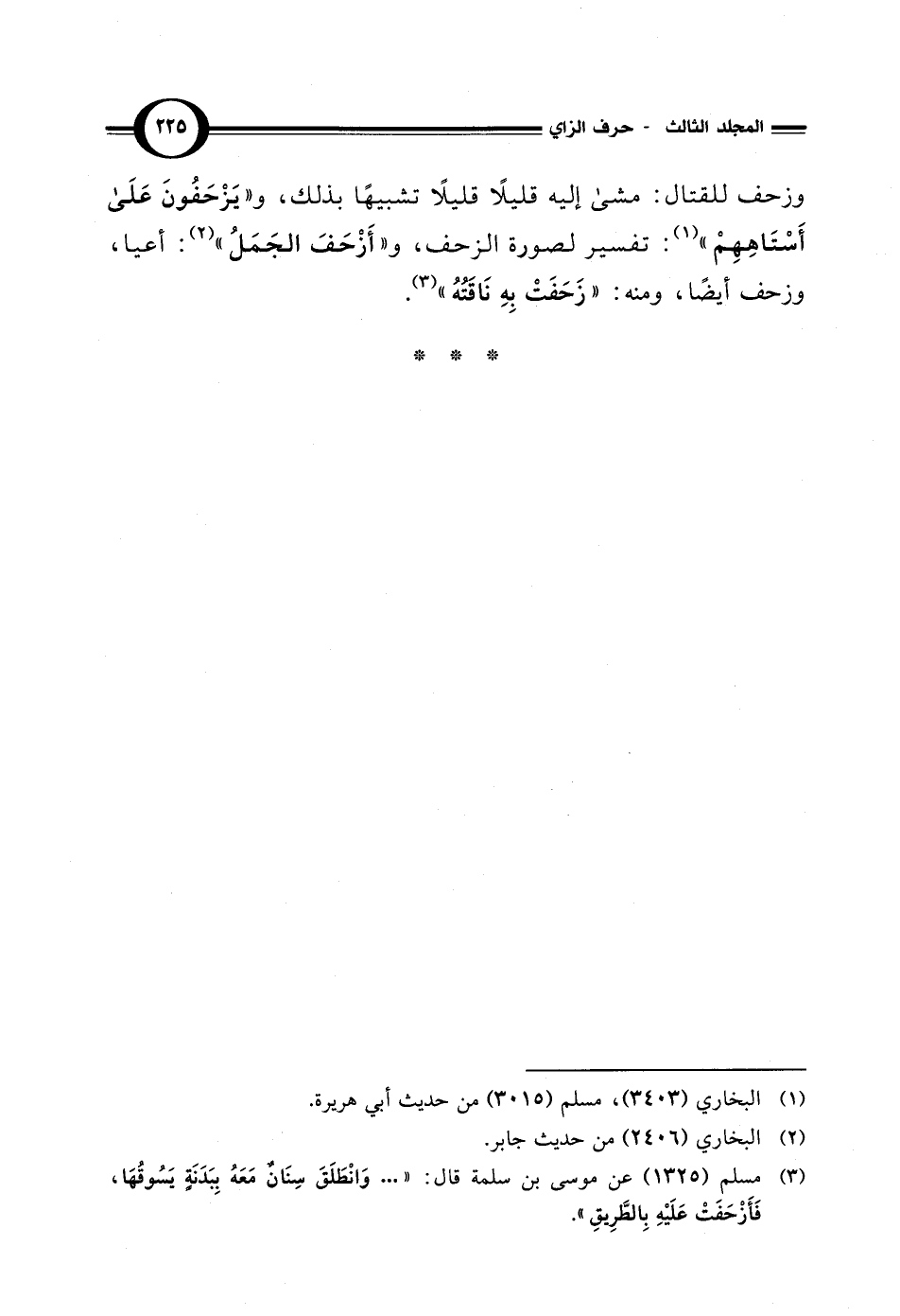 وزحف للقتال: مشى إليه قليلاً قليلاً تشبيهًا بذلك، و"يَزْحَفُونَ عَلَى أَستَاهِهِمْ" (¬1): تفسير لصورة الزحف، و"أَزْحَفَ الجَمَلُ" (¬2): أعيا، وزحف أيضًا، ومنه: "زَحَفَتْ بِهِ نَاقَتُهُ" (¬3).