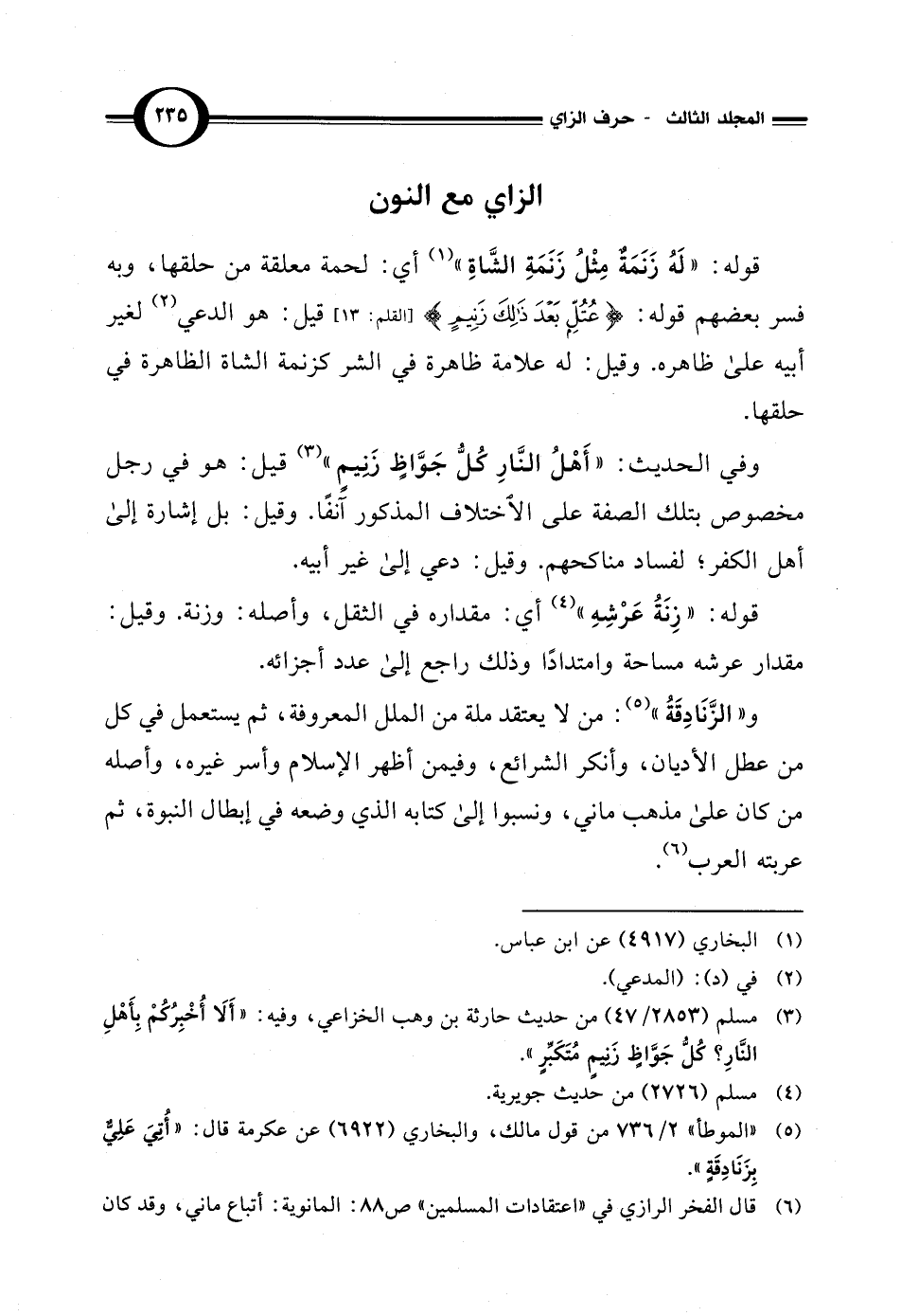 و"الزَّنَادِقَةُ" (¬5): من لا يعتقد ملة من الملل المعروفة، ثم يستعمل في كل من عطل الأديان، وأنكر الشرائع، وفيمن أظهر الإِسلام وأسر غيره، وأصله من كان على مذهب ماني، ونسبوا إلى كتابه الذي وضعه في إبطال النبوة، ثم عربته العرب (¬6).