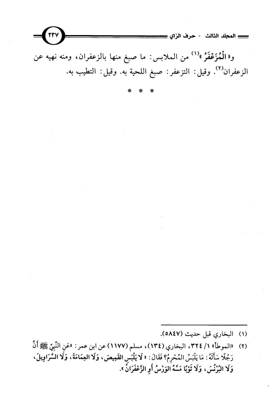 (¬2) "الموطأ" 1/ 324، البخاري (134)، مسلم (1177) عن ابن عمر: "عَنِ النَّبِيِّ - صلى الله عليه وسلم - أَنَّ رَجُلًا سَأَلَهُ: مَا يَلْبَسُ المُحْرِمُ؟ فَقَالَ: "لَا يَلْبَسِ القَمِيصَ، وَلَا العِمَامَةَ، وَلَا السَّرَاوِيلَ، وَلَا البُرْنُسَ، وَلَا ثَوْبًا مَسَّهُ الوَرْسُ أَوِ الزَّعْفَرَانُ".