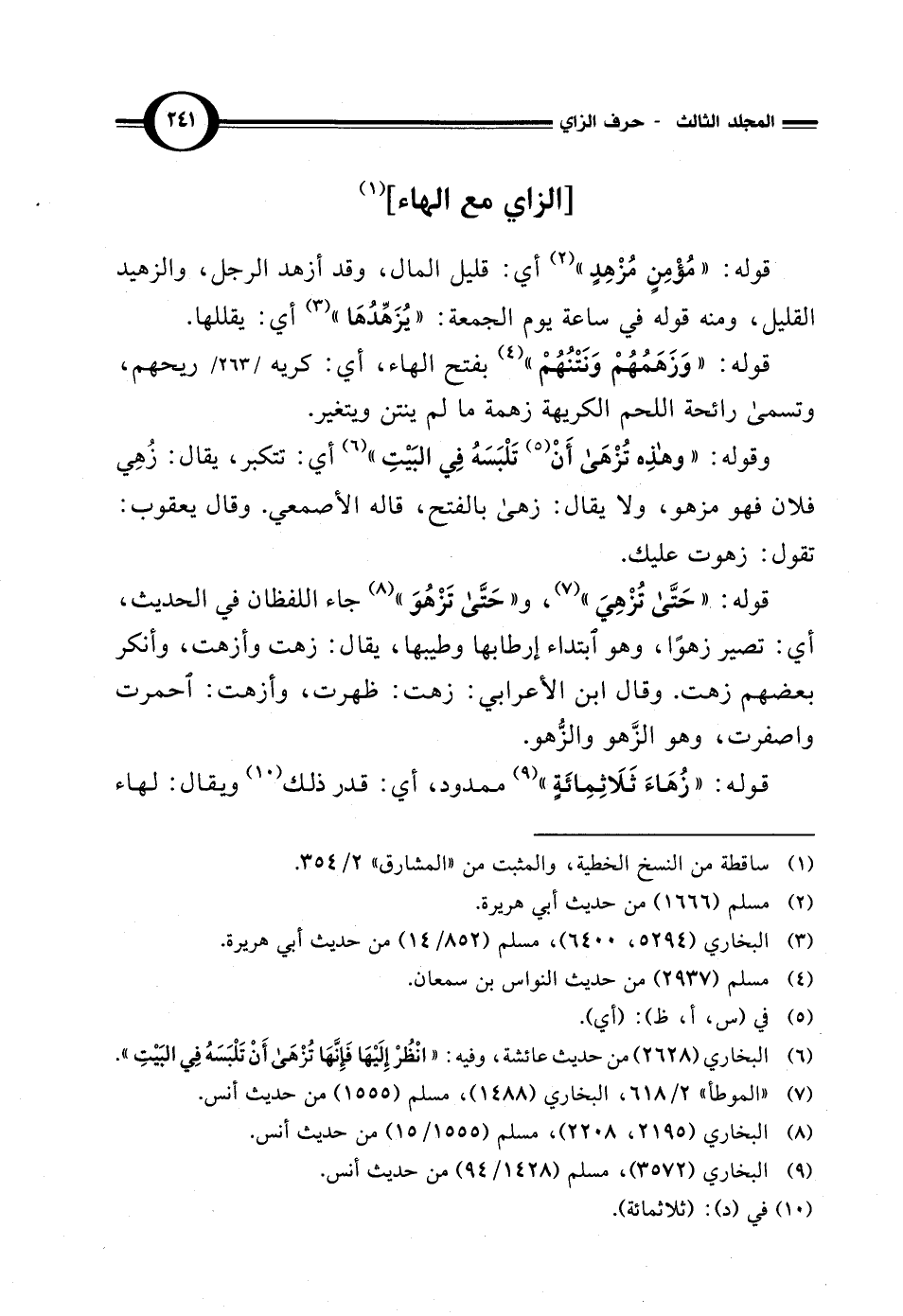 وقوله: "وهذِه تُزْهَى أَنْ (¬5) تَلْبَسَهُ في البَيْتِ" (¬6) أي: تتكبر، يقال: زُهِي فلان فهو مزهو، ولا يقال: زهى بالفتح، قاله الأصمعي. وقال يعقوب: تقول: زهوت عليك.