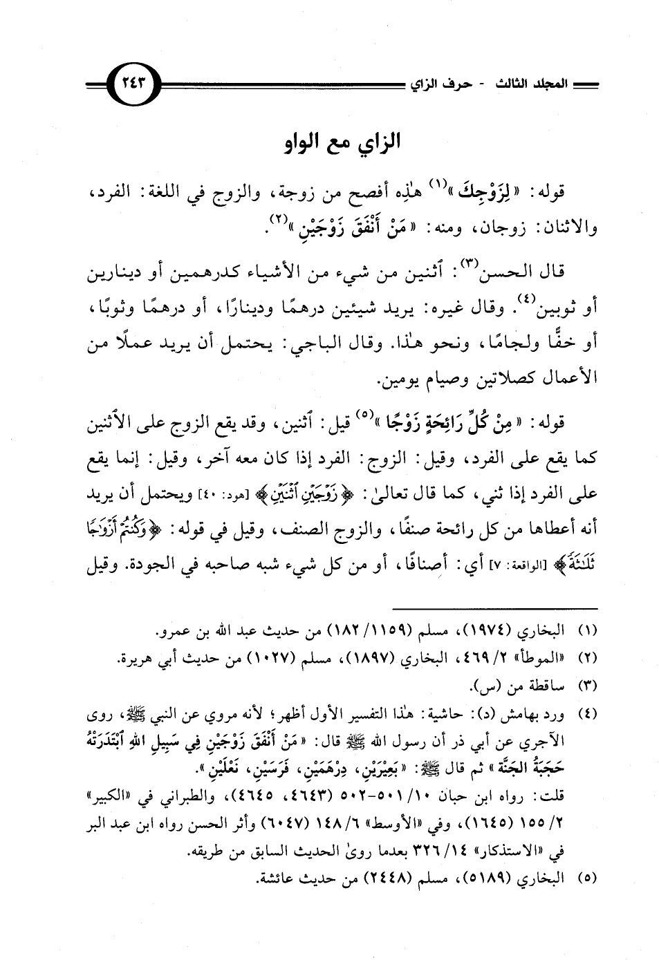 (¬4) ورد بهامش (د): حاشية: هذا التفسير الأول أظهر؛ لأنه مروي عن النبي - صلى الله عليه وسلم -، روى الآجري عن أبي ذر أن رسول الله - صلى الله عليه وسلم - قال: "مَنْ أَنْفَقَ زَوْجَيْنِ في سبِيلِ اللهِ ابْتَدَرَتْهُ حَجَبَةُ الجَنَّة" ثم قال - صلى الله عليه وسلم -: "بَعِيْرَيْنِ، دِرْهَمَيْنِ، فَرَسَيْنِ، نَعْلَيْنِ". قلت: رواه ابن حبان 10/ 501 - 502 (4643، 4645)، والطبراني في "الكبير" 2/ 155 (1645)، وفي "الأوسط" 6/ 148 (6047) وأثر الحسن رواه ابن عبد البر في "الاستذكار" 14/ 326 بعد ما روى الحديث السابق من طريقه.