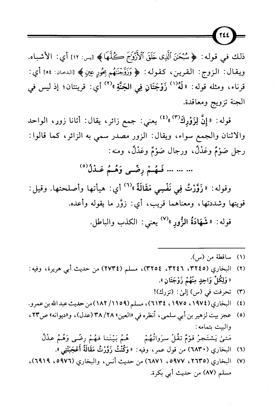 وقوله: "زَوَّرْتُ في نَفْسِي مَقَالَةً" (¬6) أي: هيأتها وأصلحتها. وقيل: قويتها وشددتها، ومعناهما قريب، أي: زوَّر ما يقوله وأعده.