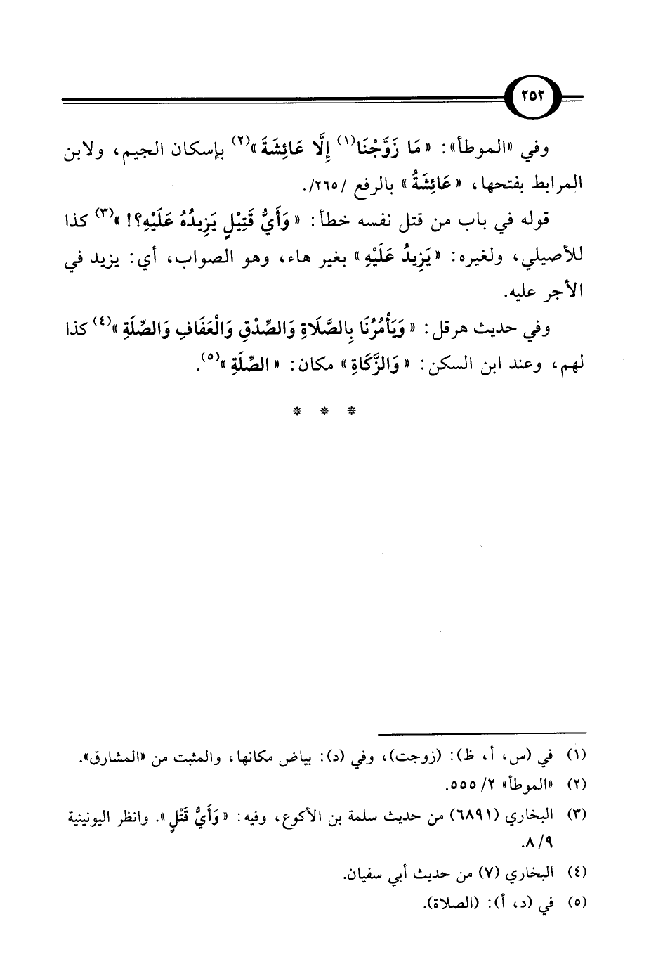 قوله في باب من قتل نفسه خطأ: "وَأَيُّ قَتِيْلٍ يَزِيدُهُ عَلَيْهِ؟! " (¬3) كذا للأصيلي، ولغيره: "يَزِيدُ عَلَيْهِ" بغير هاء، وهو الصواب، أي: يزيد في الأجر عليه.