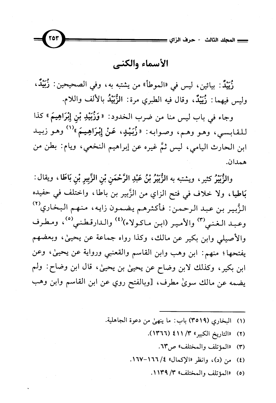 والزُّبَيْرُ كثير، ويشتبه به الزُّبَيْرُ بْنُ عَبْدِ الرَّحْمَنِ بْنِ الزَّبِيرِ بْنِ بَاطَا، ويقال: بَاطيا، ولا خلاف في فتح الزاي من الزَّبير بن باطا، واختلف في حفيده الزُّبير بن عبد الرحمن: فأكثرهم يضمون زايه، منهم البخاري (¬2) وعبد الغني (¬3) والأمير (ابن ماكولاء) (¬4) والدارقطني (¬5)، ومطرف والأصيلي وابن بكير عن مالك، وكذا رواه جماعة عن يحيى، وبعضهم يفتحها؛ منهم: ابن وهب وابن القاسم والقعنبي ورواية عن يحيى، وعن ابن بكير، وكذلك لابن وضاح عن يحيى بن يحيى، قال ابن وضاح: ولم يضمه عن مالك سوى مطرف، [وبالفتح روي عن ابن القاسم وابن وهب