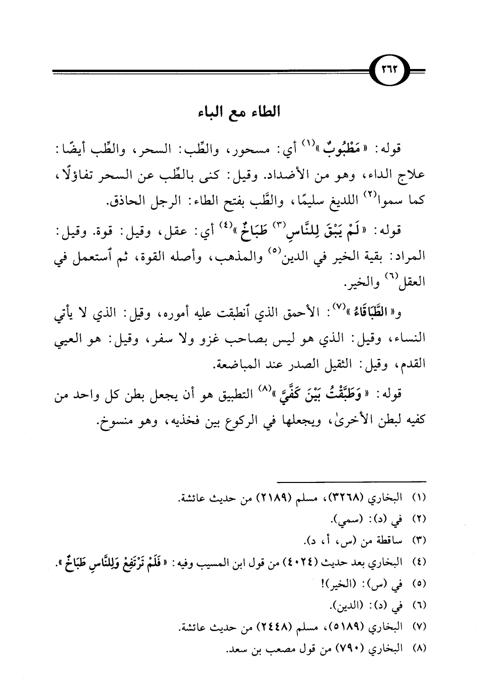 قوله: "مَطْبُوبٌ" (¬1) أي: مسحور، والطِّب: السحر، والطِّب أيضًا: علاج الداء، وهو من الأضداد. وقيل: كنى بالطِّب عن السحر تفاؤلاً، كما سموا (¬2) اللديغ سليمًا، والطَّب بفتح الطاء: الرجل الحاذق.