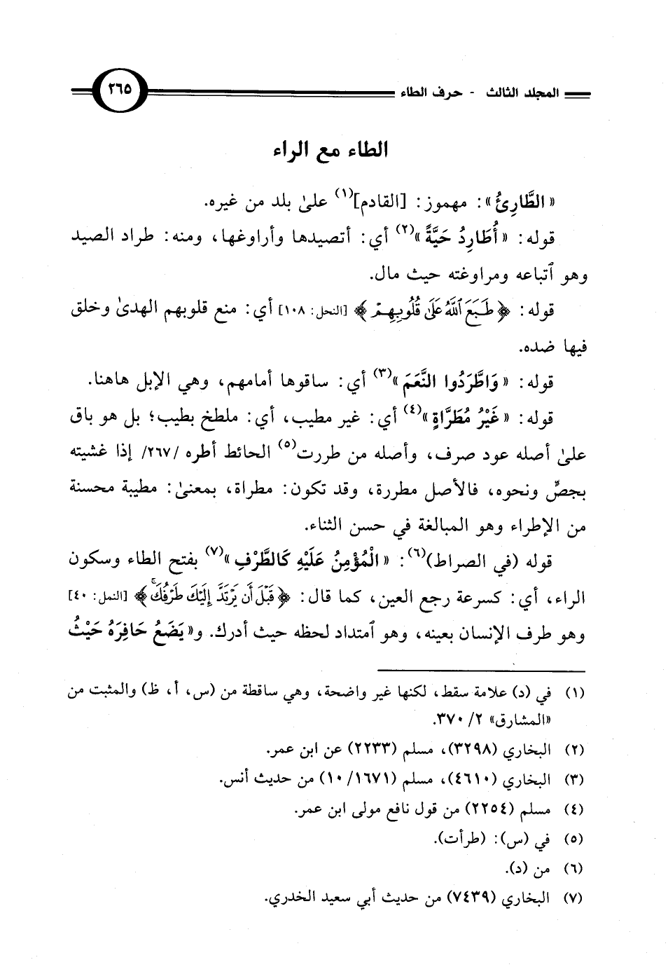 قوله (في الصراط) (¬6): "الْمُؤْمِنُ عَلَيْهِ كَالطَّرْفِ" (¬7) بفتح الطاء وسكون الراء، أي: كسرعة رجع العين، كما قال: {قَبْلَ أَنْ يَرْتَدَّ إِلَيْكَ طَرْفُكَ} [النمل: 40] وهو طرف الإنسان بعينه، وهو امتداد لحظه حيث أدرك. و"يَضَعُ حَافِرَهُ حَيْثُ