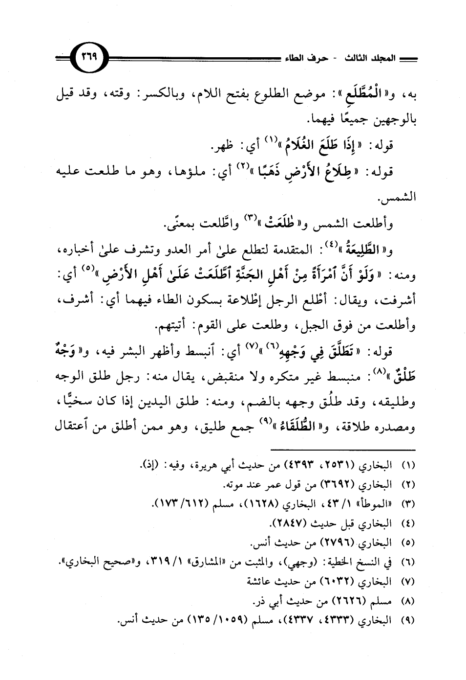 و"الطَّلِيعَةُ" (¬4): المتقدمة لتطلع على أمر العدو وتشرف على أخباره، ومنه: "وَلَوْ أَنَّ أمْرَأَةً مِنْ أَهْلِ الجَنَّةِ اطَّلَعَتْ عَلَى أَهْلِ الأَرْضِ" (¬5) أي: أشرفت، ويقال: اطْلع الرجل إطْلاعة بسكون الطاء فيهما أي: أشرف، وأطلعت من فوق الجبل، وطلعت على القوم: أتيتهم.
