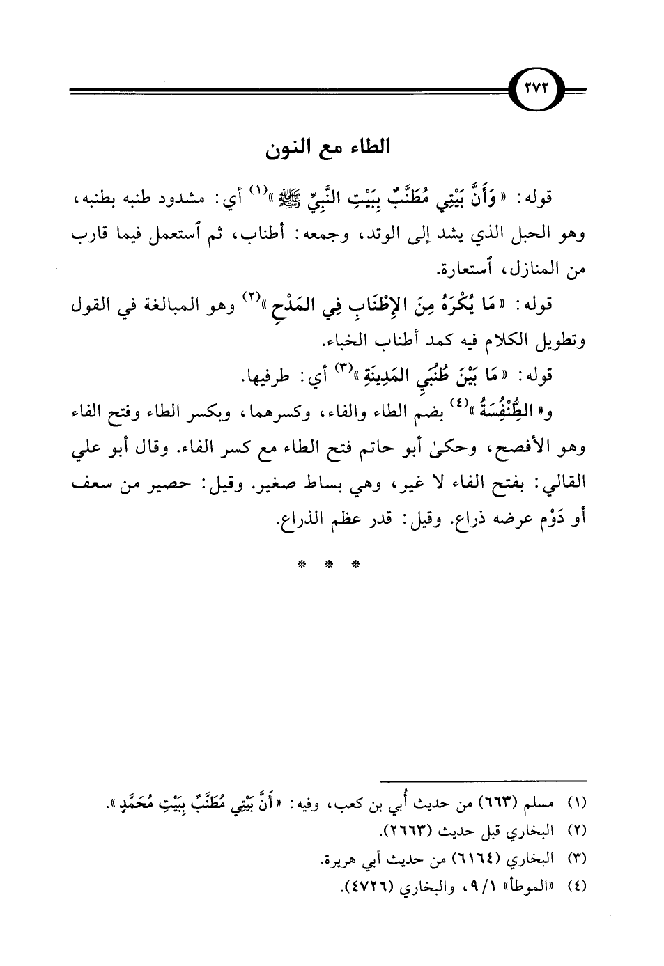 قوله: "وَأَنَّ بَيْتِي مُطَنَّبٌ بِبَيْتِ النَّبِيِّ - صلى الله عليه وسلم - " (¬1) أي: مشدود طنبه بطنبه، وهو الحبل الذي يشد إلى الوتد، وجمعه: أطناب، ثم استعمل فيما قارب من المنازل، استعارة.