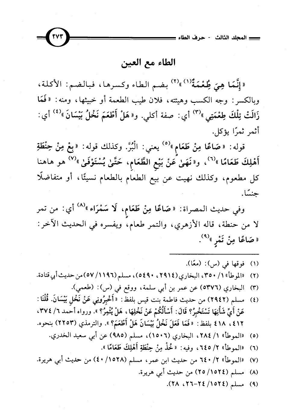 " إِنَّمَا هِيَ طُعْمَةٌ (¬1) " (¬2) بضم الطاء وكسرها، فبالضم: الأكلة، وبالكسر: وجه الكسب وهيئته، فلان طيب الطعمة أو خبيثها، ومنه: "فَمَا زَالَتْ تِلْكَ طِعْمَتِي" (¬3) أي: صفة أكلي. و"هَلْ أَطْعَمَ نَخْلُ بَيْسَانَ" (¬4) أي: أثمر ثمرًا يؤكل.