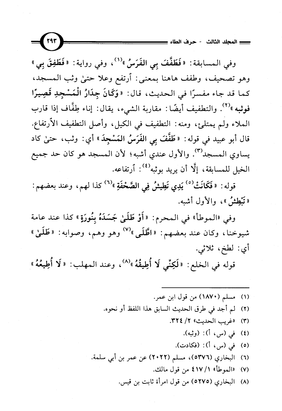 وفي المسابقة: "فَطَفَّفَ بِي الفَرَسُ" (¬1)، وفي رواية: "فَطَفِقَ بِي" وهو تصحيف، وطفف هاهنا بمعنى: ارتفع وعلا حتى وثب المسجد، كما قد جاء مفسرًا في الحديث، قال: "وَكَانَ جِدَارُ الْمَسْجِدِ قَصِيرًا فوثبه" (¬2). والتطفيف أيضًا: مقاربة الشيء، يقال: إناء طِفَّاف إذا قارب الملاء ولم يمتلئ، ومنه: التطفيف في الكيل، وأصل التطفيف الارتفاع. قال أبو عبيد في قوله: "طَفَّفَ بِي الفَرَسُ المَسْجِدَ" أي: وثب، حتى كاد يساوي المسجد (¬3). والأول عندي أشبه؛ لأن المسجد هو كان حد جميع الخيل للمسابقة، إلاَّ أن يريد بوثبه (¬4): ارتفاعه.