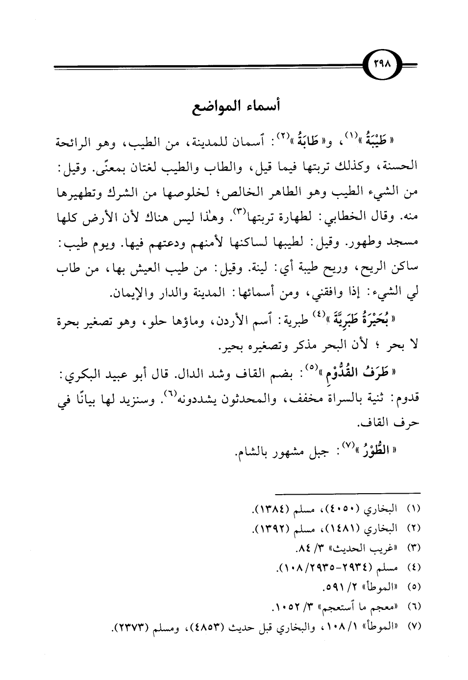 " طَيْبَةُ" (¬1)، و"طَابَةُ" (¬2): اسمان للمدينة، من الطيب، وهو الرائحة الحسنة، وكذلك تربتها فيما قيل، والطاب والطيب لغتان بمعنًى. وقيل: من الشيء الطيب وهو الطاهر الخالص؛ لخلوصها من الشرك وتطهيرها منه. وقال الخطابي: لطهارة تربتها (¬3). وهذا ليس هناك لأن الأرض كلها مسجد وطهور. وقيل: لطيبها لساكنها لأمنهم ودعتهم فيها. ويوم طيب: ساكن الريح، وريح طيبة أي: لينة. وقيل: من طيب العيش بها، من طاب لي الشيء: إذا وافقني، ومن أسمائها: المدينة والدار والإيمان.