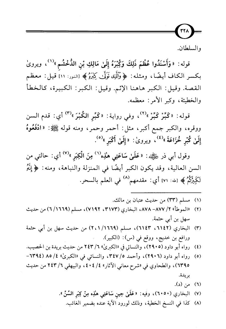 وقول أبي ذر - رضي الله عنه -:"عَلَى سَاعَتِي هذِه (¬6) مِنَ الْكِبَرِ" (¬7) أي: حالتي من السنن العالية، وقد يكون الكبر أيضًا في المنزلة والنباهة، ومنه: {إِنَّهُ لَكَبِيرُكُمُ} [طه: 71] أي: مقدمهم (¬8) في العلم بالسحر.