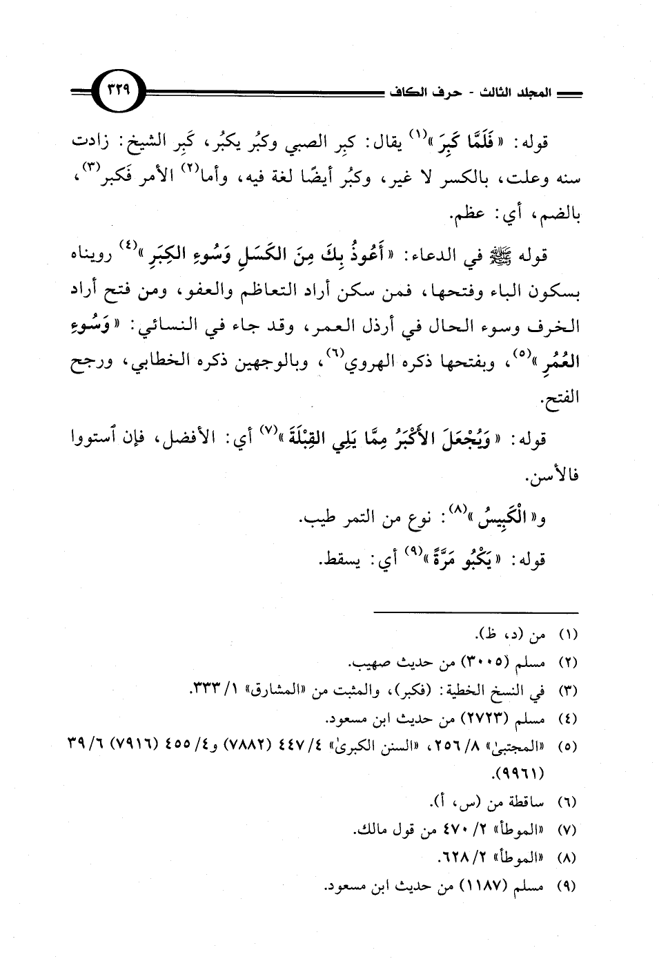 قوله - صلى الله عليه وسلم - في الدعاء: "أَعُوذُ بِكَ مِنَ الكَسَلِ وَسُوءِ الكِبَرِ" (¬4) رويناه بسكون الباء وفتحها، فمن سكن أراد التعاظم والعفو، ومن فتح أراد الخرف وسوء الحال في أرذل العمر، وقد جاء في النسائي: "وَسُوءِ العُمُرِ" (¬5)، وبفتحها ذكره الهروي (¬6)، وبالوجهين ذكره الخطابي، ورجح الفتح.