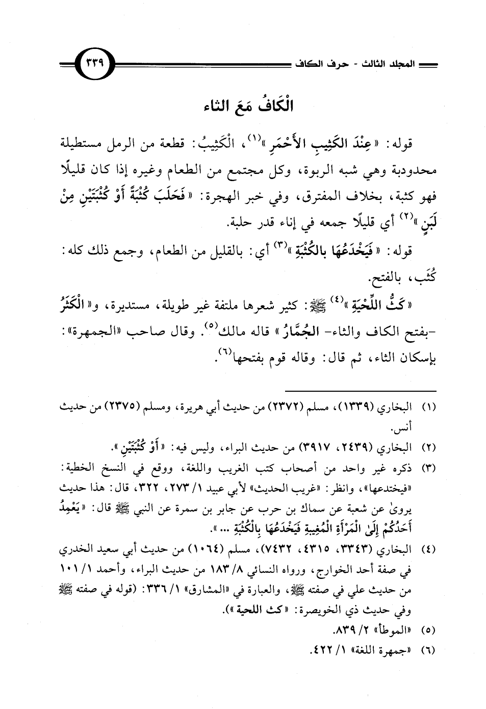 قوله: "عِنْدَ الكَثِيبِ الأَحْمَرِ" (¬1)، الْكَثِيبُ: قطعة من الرمل مستطيلة محدودبة وهي شبه الربوة، وكل مجتمع من الطعام وغيره إذا كان قليلاً فهو كثبة، بخلاف المفترق، وفي خبر الهجرة: "فَحَلَبَ كثْبَةً أَوْ كُثْبَتَيْنِ مِنْ لَبَنٍ" (¬2) أي قليلاً جمعه في إناء قدر حلبة.
