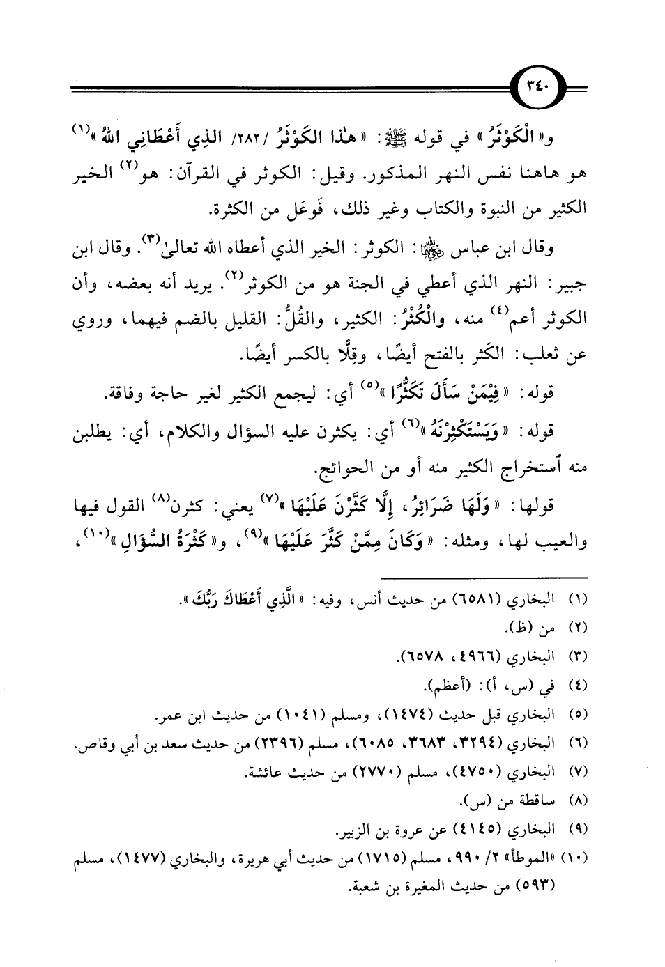 وقال ابن عباس رضي الله عنهما: الكوثر: الخير الذي أعطاه الله تعالى (¬3). وقال ابن جبير: النهر الذي أعطي في الجنة هو من الكوثر (2). يريد أنه بعضه، وأن الكوثر أعم (¬4) منه، والْكُثْرُ: الكثير، والقُلُّ: القليل بالضم فيهما، وروي عن ثعلب: الكَثر بالفتح أيضًا، وقِلًّا بالكسر أيضًا.