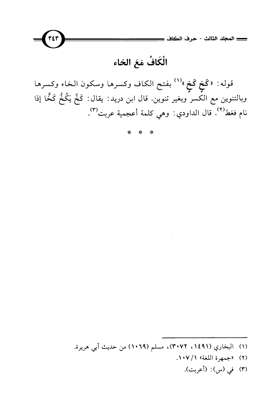 قوله: "كَخٍ كَخٍ" (¬1) بفتح الكاف وكسرها وسكون الخاء وكسرها وبالتنوين مع الكسر وبغير تنوين. قال ابن دريد: يقال: كَخَّ يَكُخُّ كَخًّا إذا نام فغط (¬2). قال الداودي: وهي كلمة أعجمية عربت (¬3).