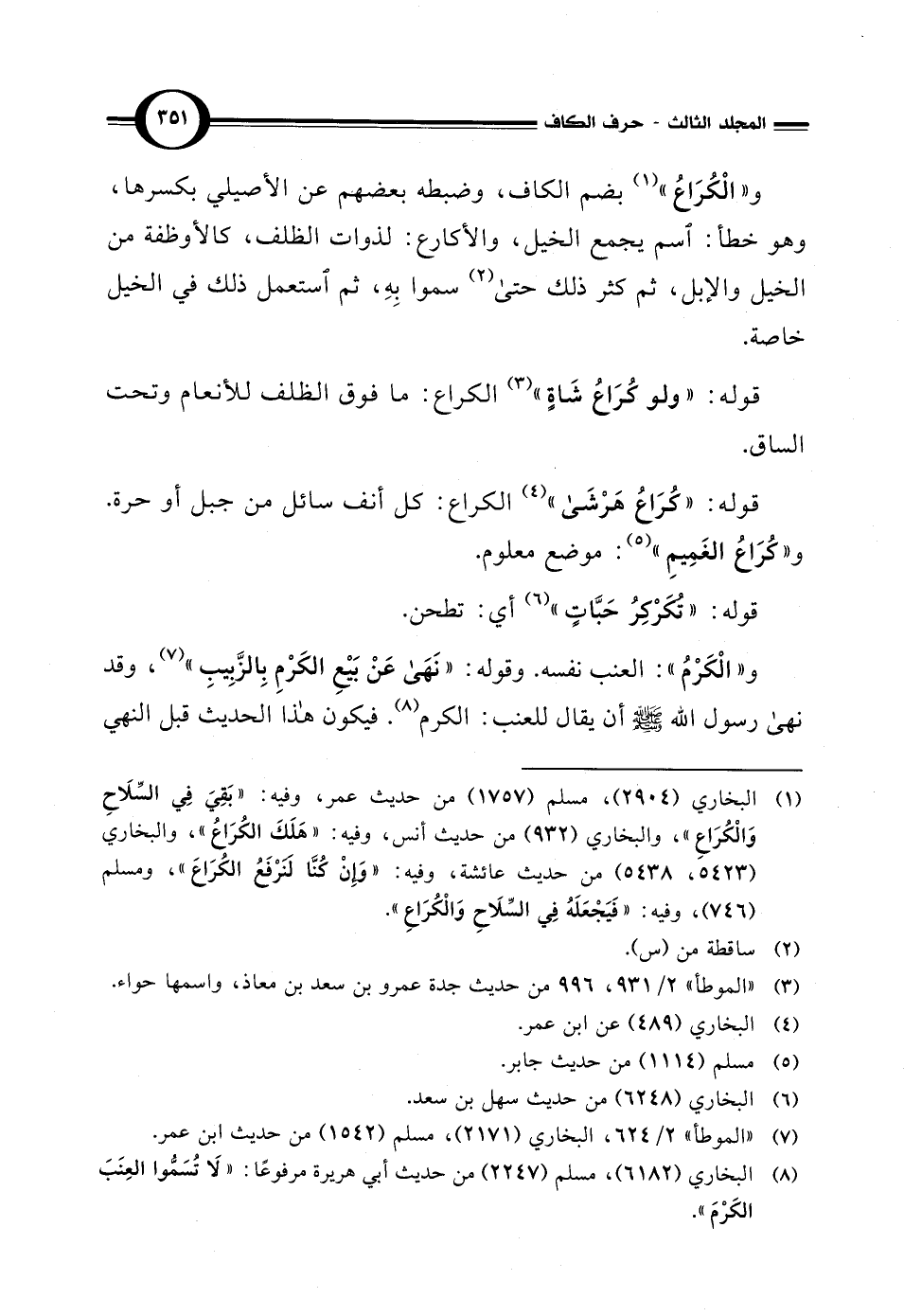 (¬1) البخاري (2904)، مسلم (1757) من حديث عمر، وفيه: "بَقِيَ في السّلَاحِ وَالْكُرَاعِ"، والبخاري (932) من حديث أنس، وفيه: "هَلَكَ الكُرَاعُ", والبخاري (5423، 5438) من حديث عائشة، وفيه: "وَإِنْ كُنَّا لنَرْفَعُ الكُرَاعَ"، ومسلم (746)، وفيه: "فَيَجْعَلَهُ في السِّلَاحِ وَالْكُرَاعِ".