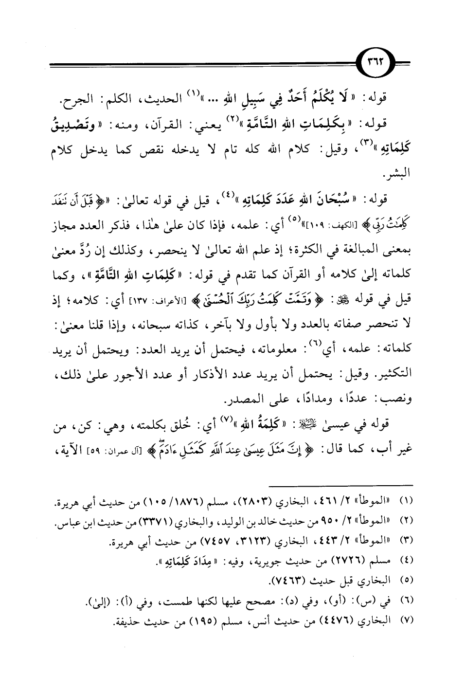 قوله: "سُبْحانَ اللهِ عَدَدَ كَلِماتِهِ" (¬4)، قيل في قوله تعالى: {قَبْلَ أَنْ تَنْفَدَ كَلِمَاتُ رَبِّي} [الكهف: 109] (¬5) أي: علمه، فإذا كان على هذا، فذكر العدد مجاز بمعنى المبالغة في الكثرة؛ إذ علم الله تعالى لا ينحصر، وكذلك إن رُدَّ معنى كلماته إلى كلامه أو القرآن كما تقدم في قوله: "كَلِماتِ اللهِ التَّامَّةِ"، وكما قيل في قوله عز وجل: {وَتَمَّتْ كَلِمَتُ رَبِّكَ الْحُسْنَى} [الأعراف: 137] أي: كلامه؛ إذ لا تنحصر صفاته بالعدد ولا بأول ولا بآخر، كذاته سبحانه، وإذا قلنا معنى: كلماته: علمه، أي (¬6): معلوماته، فيحتمل أن يريد العدد: ويحتمل أن يريد التكثير. وقيل: يحتمل أن يريد عدد الأذكار أو عدد الأجور على ذلك، ونصب: عددًا، ومدادًا، على المصدر.