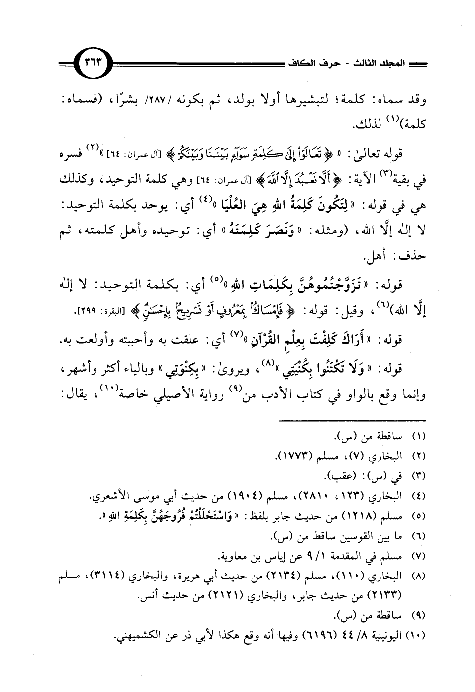 قوله تعالى: {تَعَالَوْا إِلَى كَلِمَةٍ سَوَاءٍ بَيْنَنَا وَبَيْنَكُمْ} [آل عمران: 64] (¬2) فسره في بقية (¬3) الآية: {أَلَّا نَعْبُدَ إِلَّا اللَّهَ} [آل عمران: 64] وهي كلمة التوحيد، وكذلك هي في قوله: "لِتَكُونَ كلِمَةُ اللهِ هِيَ العُلْيا" (¬4) أي: يوحد بكلمة التوحيد: لا إله إلّا الله، (ومثله: "وَنَصَرَ كَلِمَتَهُ" أي: توحيده وأهل كلمته، ثم حذف: أهل.