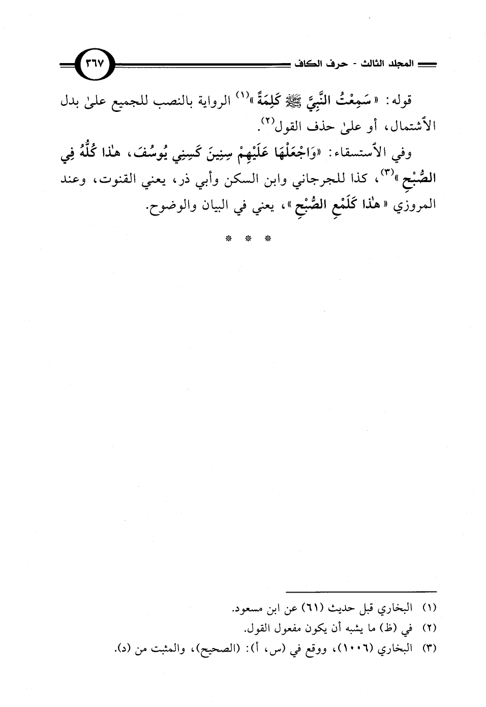 قوله: "سَمِعْتُ النَّبِيَّ - صلى الله عليه وسلم - كَلِمَةً" (¬1) الرواية بالنصب للجميع على بدل الاشتمال، أو على حذف القول (¬2).