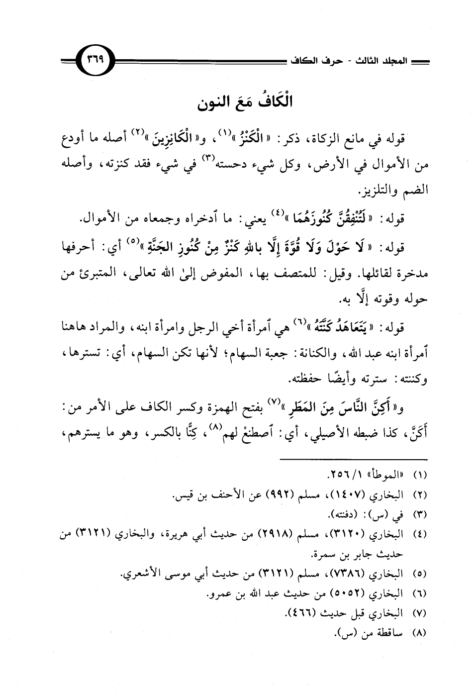 قوله في مانع الزكاة، ذكر: "الْكَنْزُ" (¬1)، و"الْكانِزِينَ" (¬2) أصله ما أودع من الأموال في الأرض، وكل شيء دحسته (¬3) في شيء فقد كنزته، وأصله الضم والتلزيز.