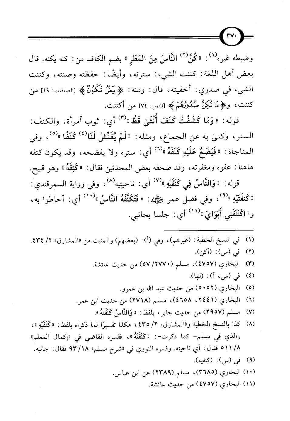 (¬8) كذا بالنسخ الخطية و"المشارق" 2/ 435، هكذا تفسيرًا لما ذكراه بلفظ: "كَنَفَيْهِ"، والذي في مسلم - كما ذكرت -: "كنَفَتَهُ"، ففسره القاضي في "إكمال المعلم" 8/ 511 فقال: أي ناحيته. وفسره النووي في "شرح مسلم" 18/ 93 فقال: جانبه.