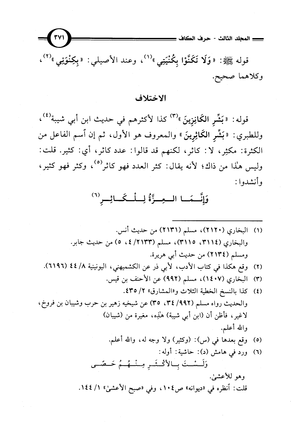 قوله: "بَشِّرِ الكانِزِينَ" (¬3) كذا لأكثرهم في حديث ابن أبي شيبة (¬4)، وللطبري: "بَشِّرِ الكاثِرِينَ" والمعروف هو الأول، ثم إن اسم الفاعل من الكثرة: مكثِر، لا: كاثر، لكنهم قد قالوا: عدد كاثر، أي: كثير. قلت: وليس هذا من ذاك؛ لأنه يقال: أكثر العدد فهو كاثر (¬5)، وكثر فهو كثير، وأنشدوا: