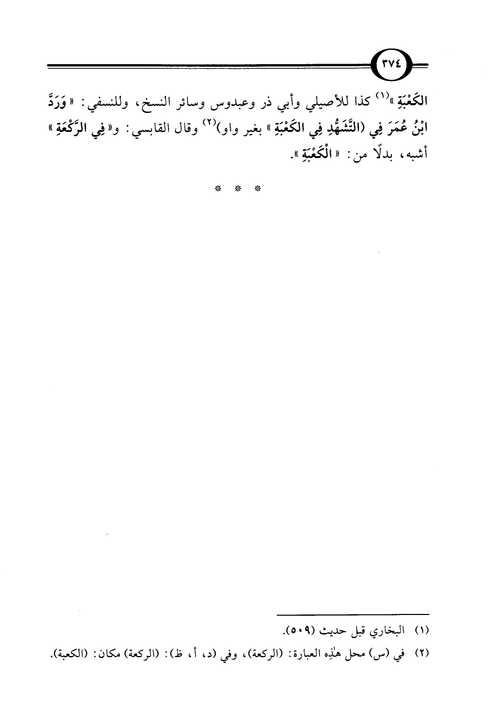الكَعْبَةِ" (¬1) كذا للأصيلي وأبي ذر وعبدوس وسائر النسخ، وللنسفي: "وَرَدَّ ابْنُ عُمَرَ في (التَّشَهُّدِ في الكَعْبَةِ" بغير واو) (¬2) وقال القابسي: و"في الرَّكْعَةِ" أشبه، بدلًا من: "الْكَعْبَةِ".