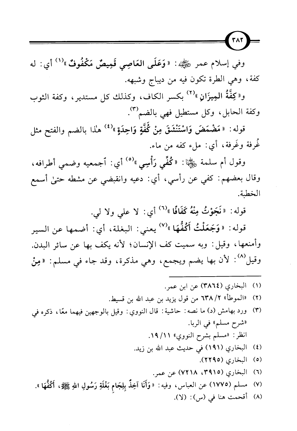 وفي إسلام عمر - رضي الله عنه -: "وَعَلَى العاصِي قَمِيصٌ مَكْفُوفٌ" (¬1) أي: له كفة، وهي الطرة تكون فيه من ديباج وشبهه.