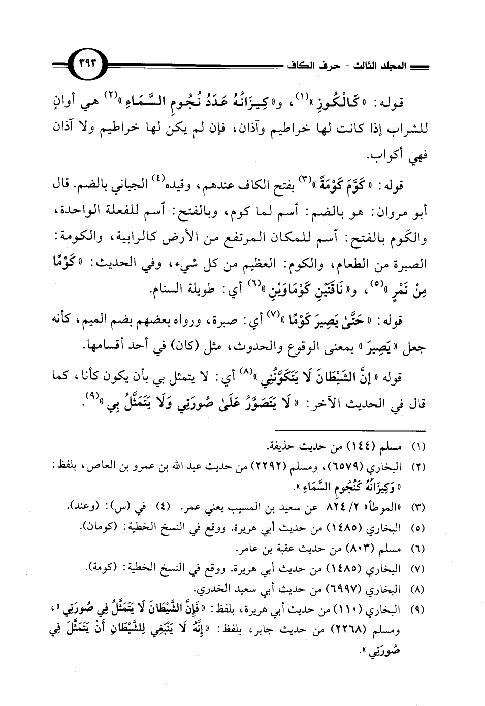 قوله: "كَوَّمَ كَوْمَةً" (¬3) بفتح الكاف عندهم، وقيده (¬4) الجياني بالضم. قال أبو مروان: هو بالضم: اسم لما كوم، وبالفتح: اسم للفعلة الواحدة، والكَوم بالفتح؛ اسم للمكان المرتفع من الأرض كالرابية، والكومة: الصبرة من الطعام، والكوم: العظيم من كل شيء، وفي الحديث: "كَوْمًا مِنْ تَمْرٍ" (¬5)، و"نَاقَتَيْنِ كَوْمَاوَيْنِ" (¬6) أي: طويلة السنام.