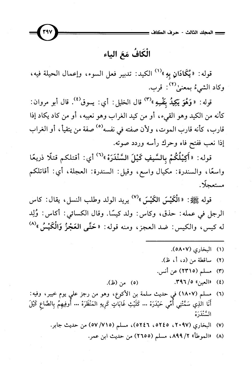 قوله: "وَهُوَ يكيدُ بِنَفْسِهِ" (¬3) قال الخليل: أي: يسوق (¬4). قال أبو مروان: كأنه من الكيد وهو القيء، أو من كيد الغراب وهو نعيبه، أو من كاد يكاد إذا قارب، كأنه قارب الموت، ولأن صفته في نفسه (¬5) صفة من يتقيأ، أو الغراب إذا نعب ففتح فاه وحرك رأسه وردد صوته.