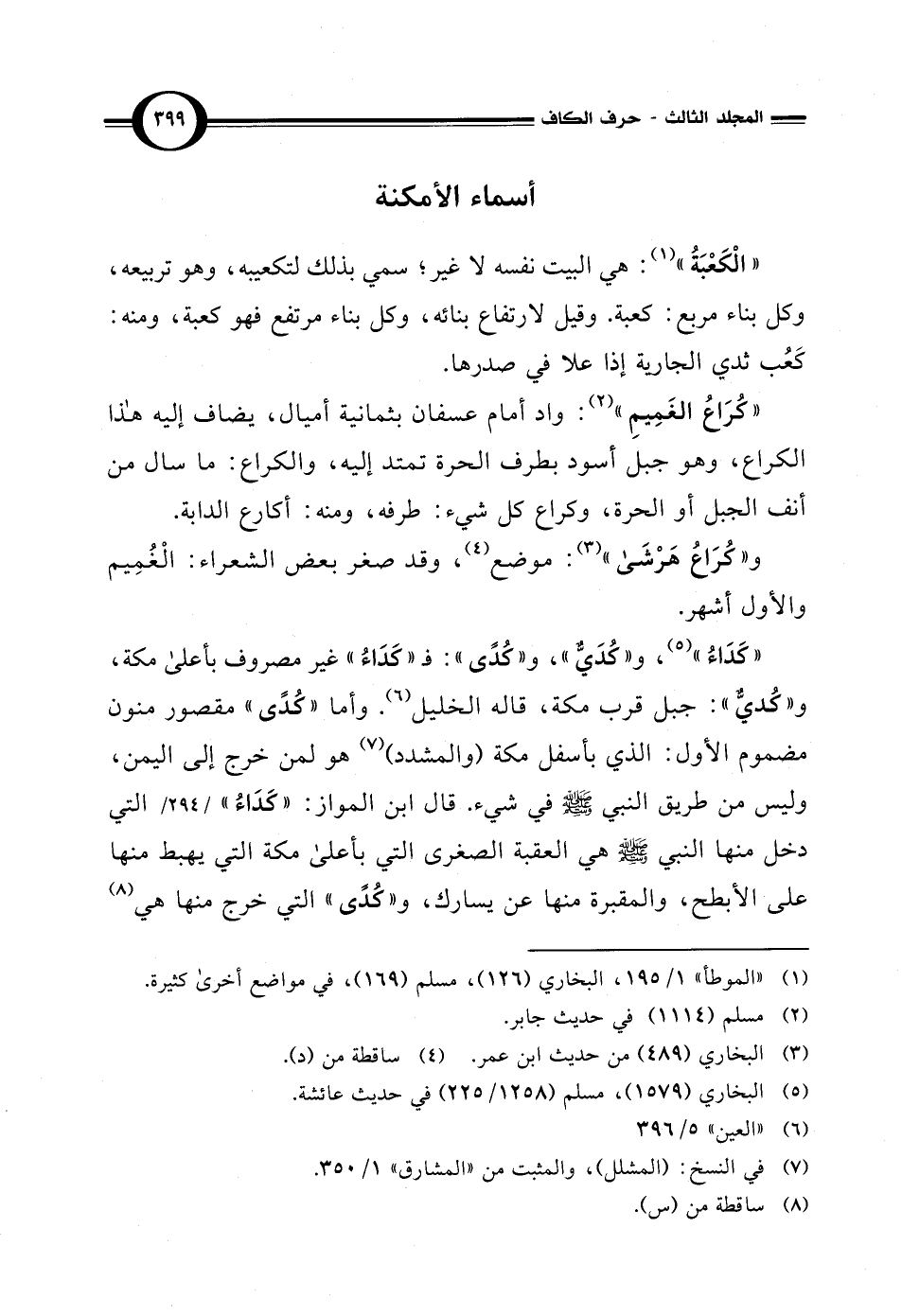 "كَداءُ" (¬5)، و"كُدَيٌّ"، و"كُدًى": فـ"كَداءُ" غير مصروف بأعلى مكة، و"كُديٌّ": جبل قرب مكة، قاله الخليل (¬6). وأما "كُدًى" مقصور منون مضموم الأول: الذي بأسفل مكة (والمشدد) (¬7) هو لمن خرج إلى اليمن، وليس من طريق النبي - صلى الله عليه وسلم - في شيء. قال ابن المواز: "كَداءُ" التي دخل منها النبي - صلى الله عليه وسلم - هي العقبة الصغرى التي بأعلى مكة التي يهبط منها على الأبطح، والمقبرة منها عن يسارك، و"كُدًى" التي خرج منها هي (¬8)