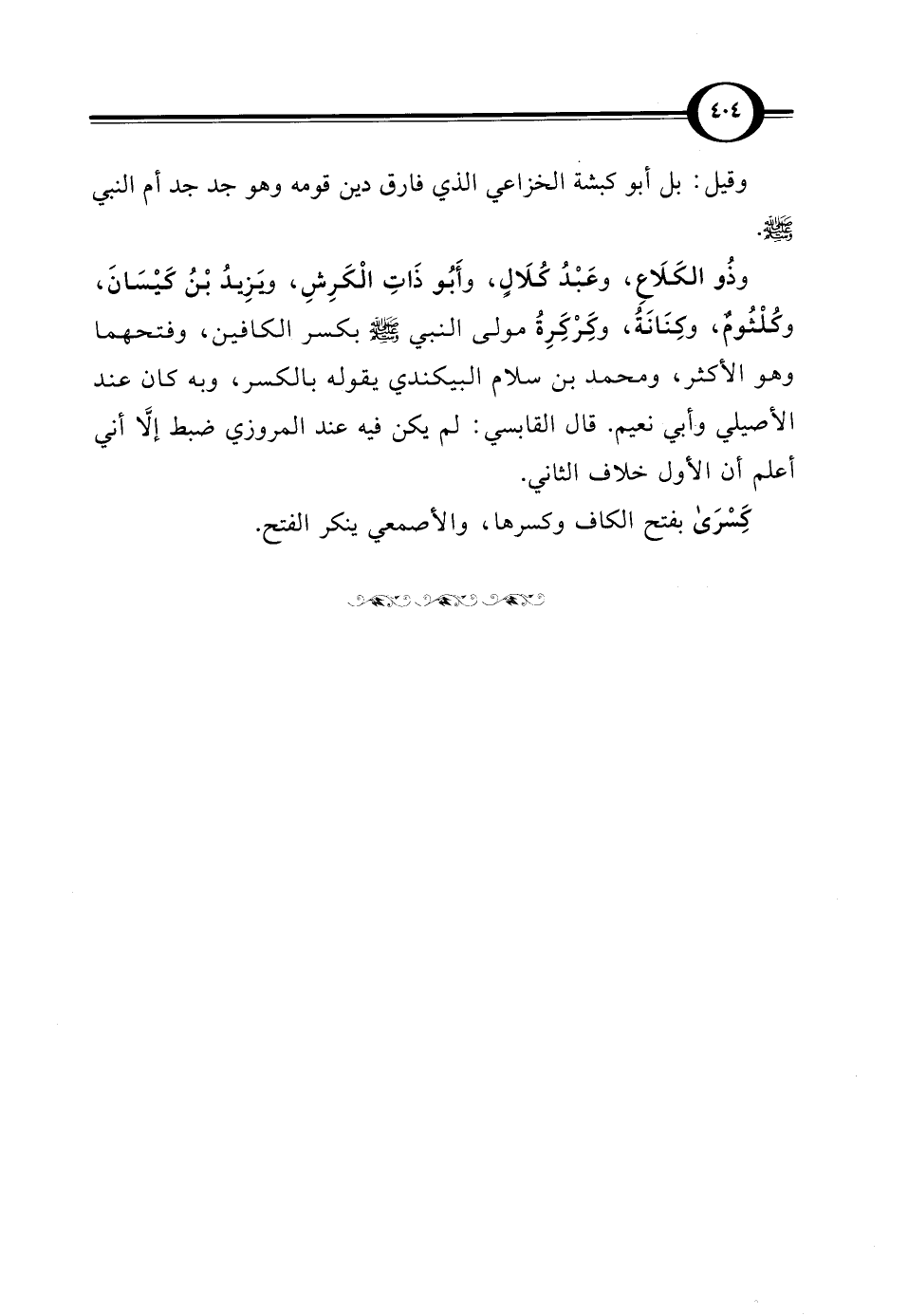 وذُو الكَلَاعِ، وعَبْدُ كُلَالٍ، وأَبُو ذاتِ الْكَرِشِ، ويَزِيدُ بْنُ كيْسانَ، وكُلْثُومٌ، وكِنَانَةُ، وكَرْكِرِةُ مولى النبي -صلى الله عليه وسلم- بكسر الكافين، وفتحهما وهو الأكثر، ومحمد بن سلام البيكندي يقوله بالكسر، وبه كان عند الأصيلي وأبي نعيم. قال القابسي: لم يكن فيه عند المروزي ضبط إلا أني أعلم أن الأوّل خلاف الثاني.