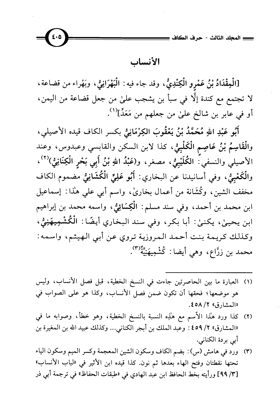 أَبُو عَبْدِ اللهِ مُحَمَّدُ بْنُ يَعْقُوبَ الكِرْمانِيُّ بكسر الكاف قيده الأصيلي، والْقاسِمُ بْنُ عاصِمٍ الْكَلْبِيُّ، كذا لابن السكن والقابسي وعبدوس، وعند الأصيلي والنسفي: الكُلَيْبِيُّ، مصغر، و (عَبْدُ اللهِ بْنُ أَبِي بَحْرٍ الْكِنانِيُّ) (¬2)، والْكَعْبِيُّ، وفي أسانيدنا عن البخاري: أَبُو عَلِيُّ الْكُشانِيُّ مضموم الكاف مخفف الشين، وكُشانة من أعمال بخارى، واسم أبي علي هذا: إسماعيل ابن محمَّد بن أحمد، وفي سند مسلم: الْكِسائِيُّ، واسمه محمَّد بن إبراهيم ابن يحيي، يكنى: أبا بكر، وفي سند البخاري أيضًا: الْكُشْمِيهَنِيُّ، وكذلك كريمة بنت أحمد المروزية تروي عن أبي الهيثم، واسمه: محمَّد بن زرَّاع، وهي أيضًا: كُشْمِيهَنِيَّةٌ (¬3).