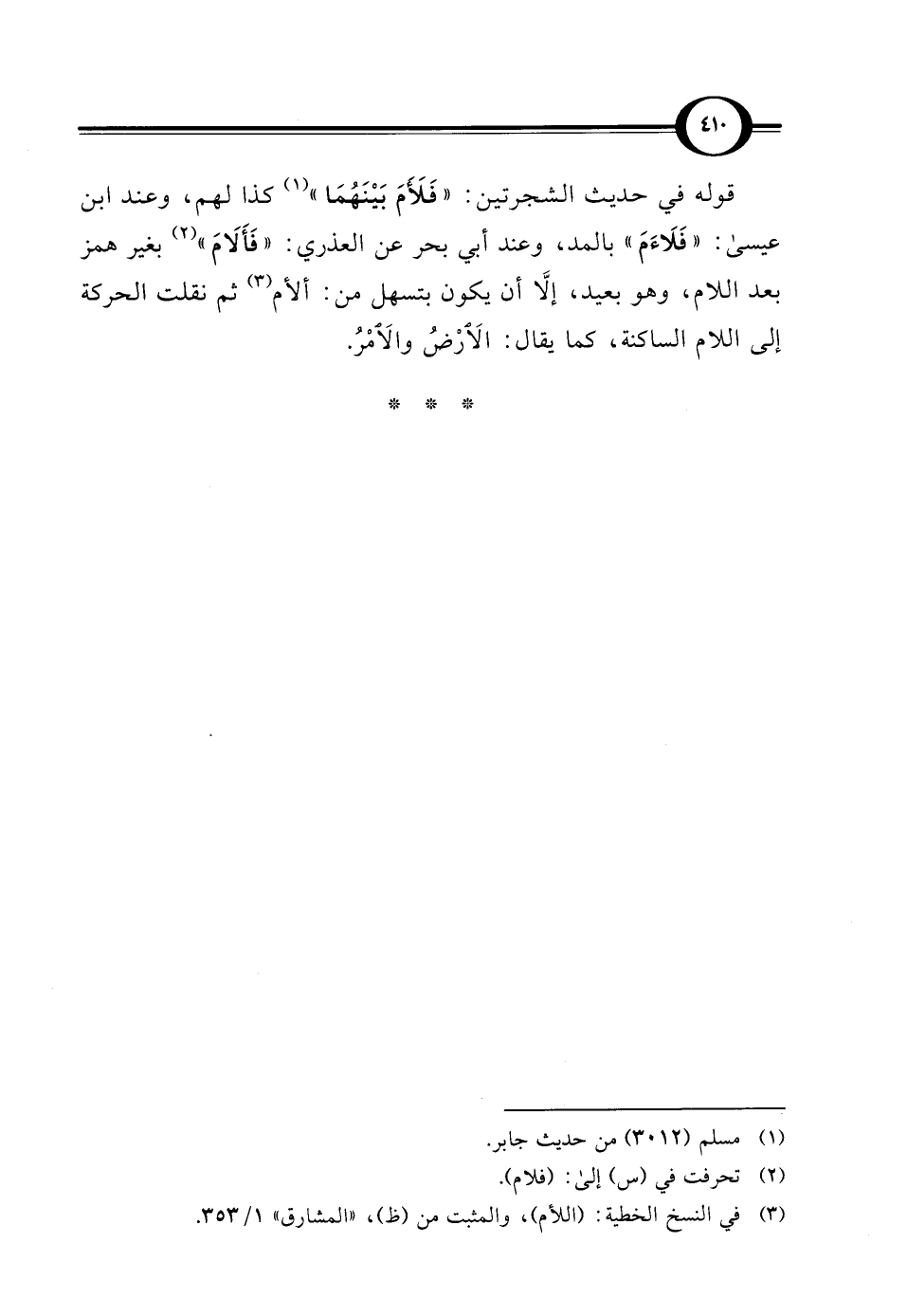 قوله في حديث الشجرتين: "فَلَأَمَ بَيْنَهُمَا" (¬1) كذا لهم، وعند ابن عيسى: "فَلَاءَمَ" بالمد، وعند أبي بحر عن العذري: "فَأَلَامَ" (¬2) بغير همز بعد اللام، وهو بعيد، إلَّا أن يكون بتسهل من: ألأم (¬3) ثم نقلت الحركة إلى اللام الساكنة، كما يقال: الارْضُ والامْرُ.