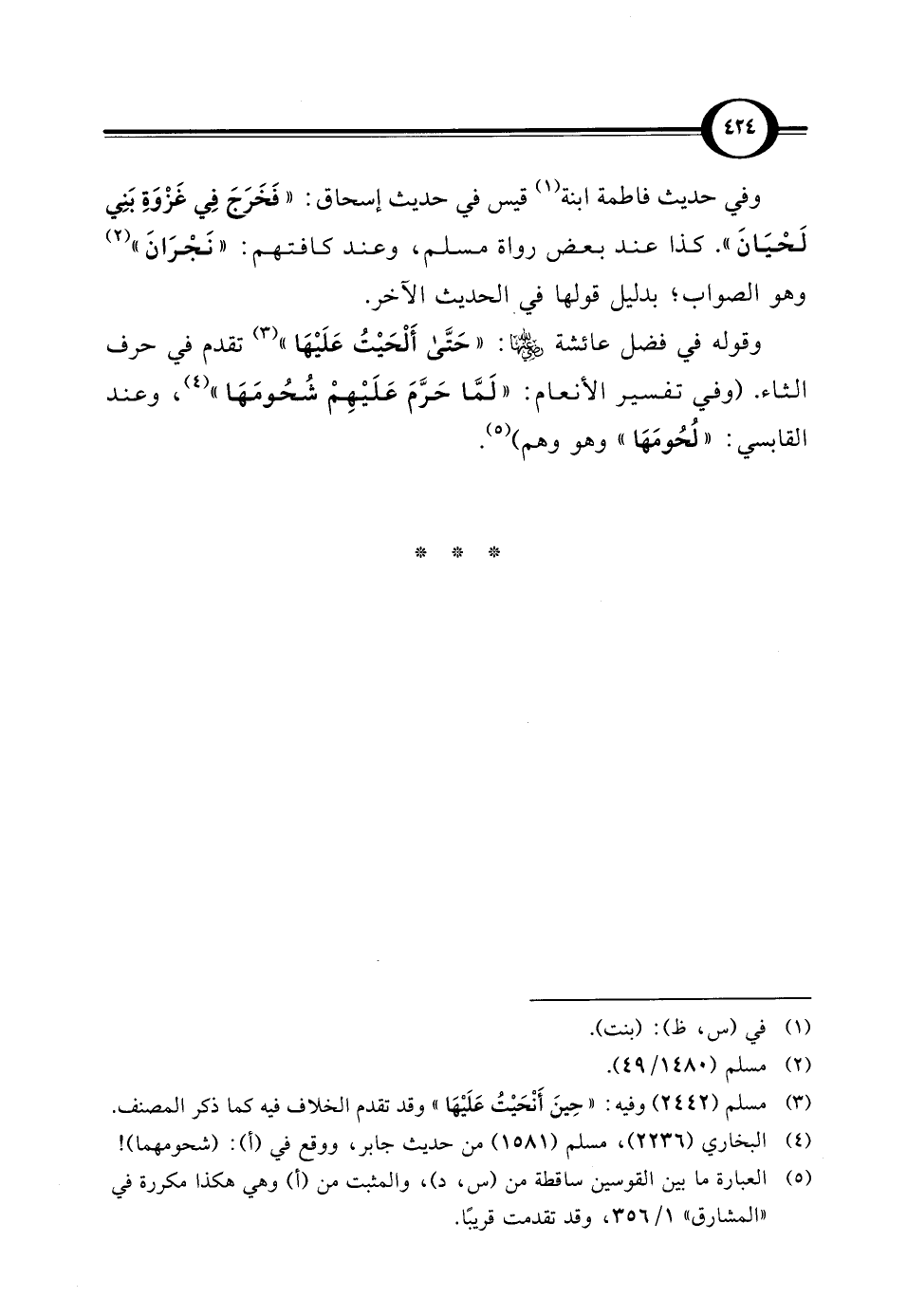 وقوله في فضل عائشة رضي الله عنها "حَتَّى أَلْحَيْتُ عَلَيْهَا" (¬3) تقدم في حرف الثاء. (وفي تفسير الأنعام: "لَمَّا حَرَّمَ عَلَيْهِمْ شُحُومَهَا" (¬4)، وعند القابسي: "لُحُومَهَا" وهو وهم) (¬5).