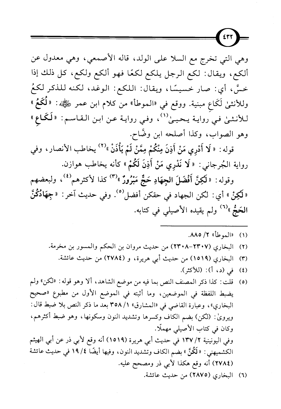 (¬5) قلت: كذا ذكر المصنف النص بما فيه من موضع الشاهد، ألا وهو قوله: "لكن" ولم يضبط اللفظة في الموضعين، وما أثبته في الموضع الأول من مطبوع "صحيح البخاري"، وعبارة القاضي في "المشارق" 1/ 358 بعد ما ذكر النص بلا ضبط قال: ويروى: (لكن) بضم الكاف وكسرها وتشديد النون وسكونها، وهو ضبط أكثرهم، وكان في كتاب الأصيلي مهملًا. وفي اليونينية 2/ 137 في حديث أبي هريرة (1519) أنه وقع لأبي ذر عن أبي الهيثم الكشميهني: "لَكُنَّ" بضم الكاف وتشديد النون، وفيها أيضًا 4/ 19 في حديث عائشة (2784) أنه وقع هكذا لأبي ذر ومصحح عليه.