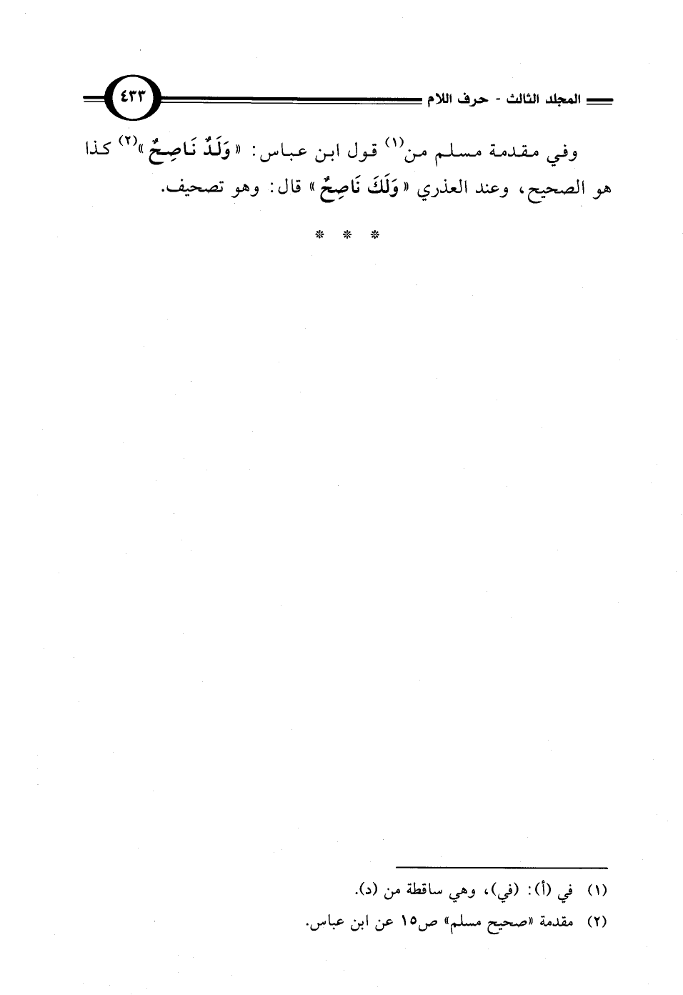 وفي مقدمة مسلم من (¬1) قول ابن عباس: "وَلَدٌ نَاصِحٌ" (¬2) كذا هو الصحيح، وعند العذري "وَلَكَ نَاصِحٌ" قال: وهو تصحيف.