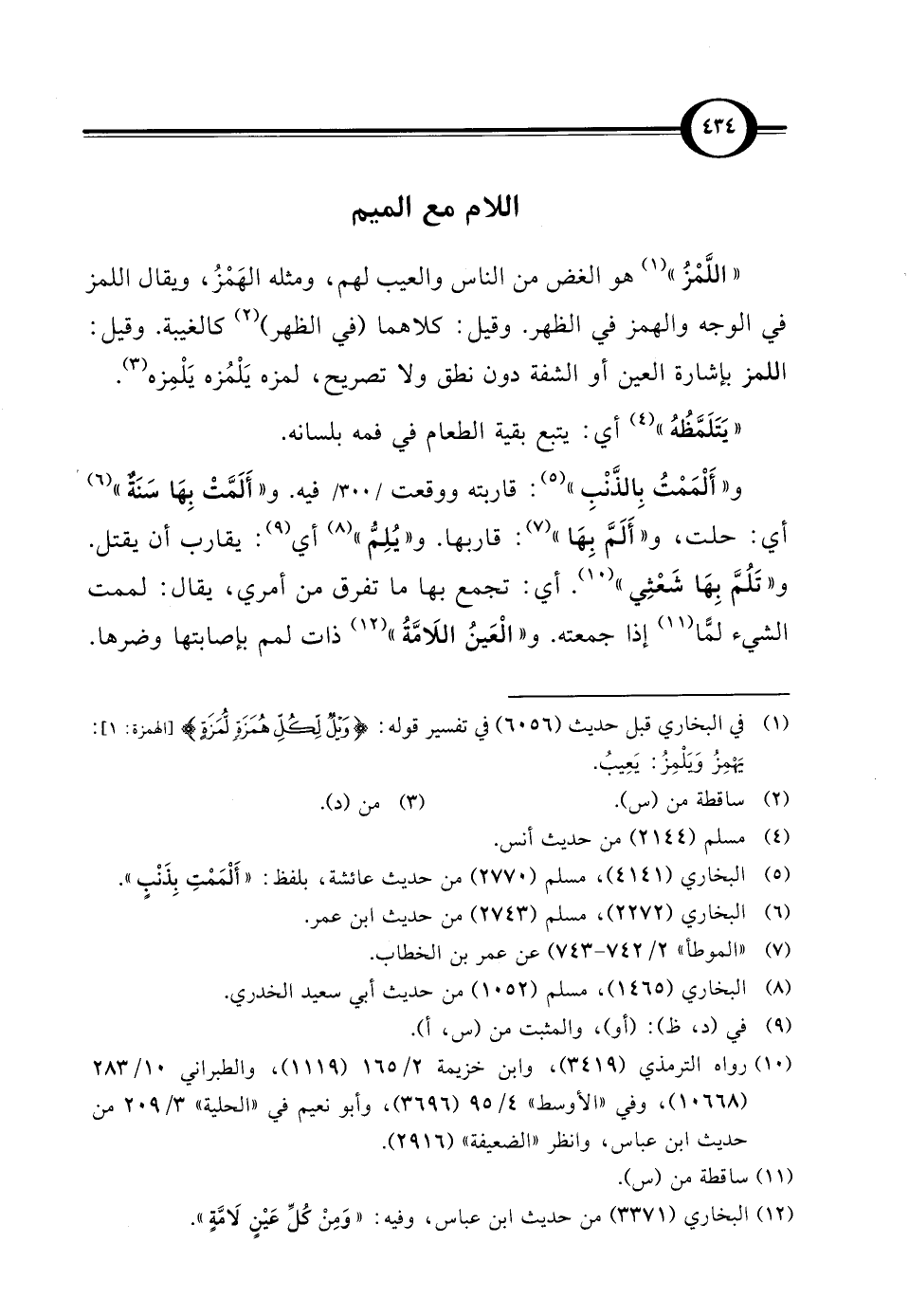 و"أَلْمَمْتُ بِالذَّنْبِ" (¬5): قاربته ووقعت فيه. و"أَلَمَّتْ بِهَا سَنَةٌ" (¬6) أي: حلت، و"أَلَمَّ بِهَا" (¬7): قاربها. و"يُلِمُّ" (¬8) أي (¬9): يقارب أن يقتل.