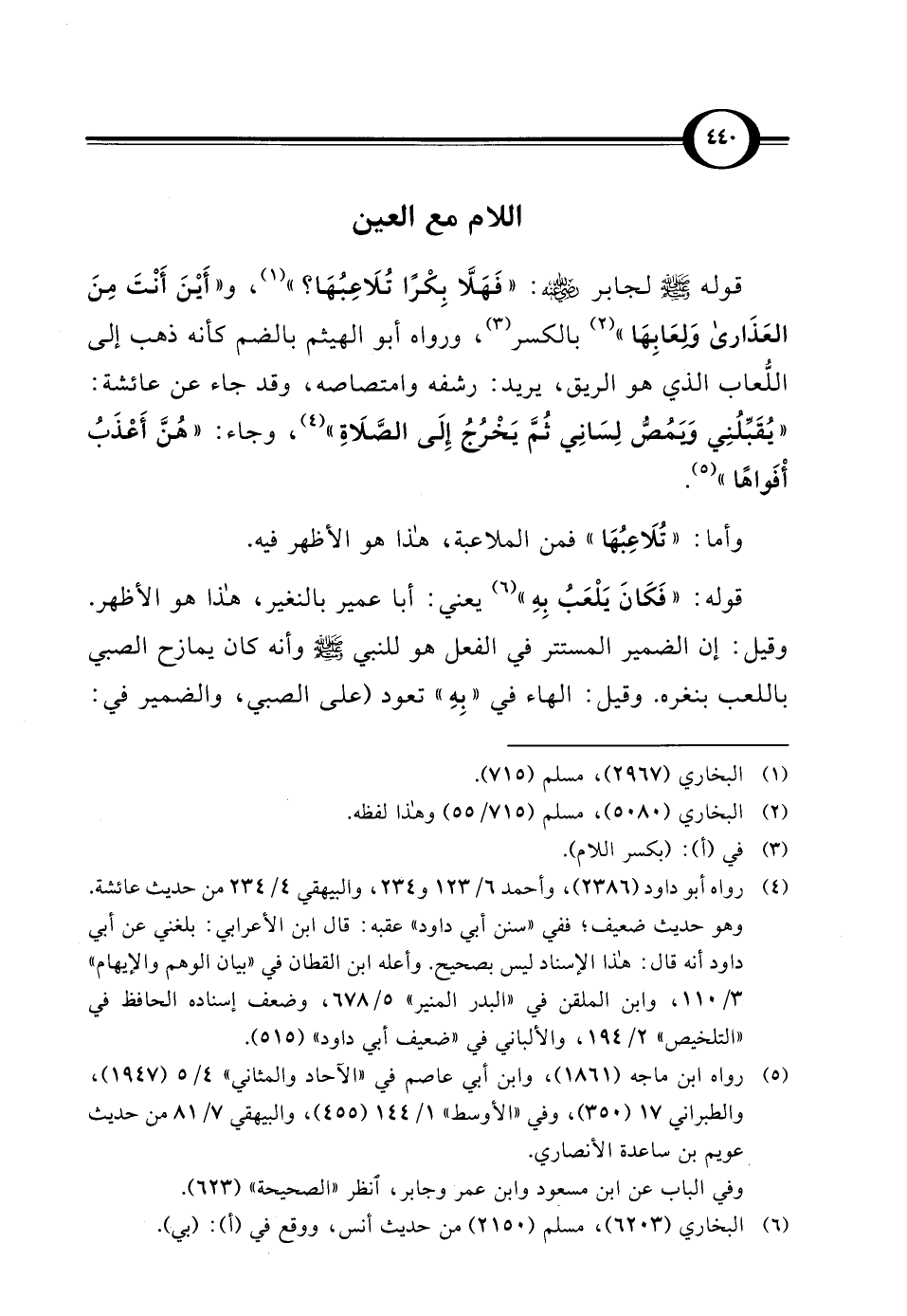 قوله - صلى الله عليه وسلم - لجابر - رضي الله عنه -: "فَهَلَّا بِكْرًا تُلَاعِبُهَا؟ " (¬1)، و"أَيْنَ أَنْتَ مِنَ العَذَارى وَلعَابِهَا" (¬2) بالكسر (¬3)، ورواه أبو الهيثم بالضم كأنه ذهب إلى اللُّعاب الذي هو الريق، يريد: رشفه وامتصاصه، وقد جاء عن عائشة: "يُقَبِّلُنِي وَيَمُصُّ لِسَانِي ثُمَّ يَخْرُجُ إِلَى الصَّلَاةِ" (¬4)، وجاء: "هُنَّ أَعْذَبُ أْفَواهًا" (¬5).