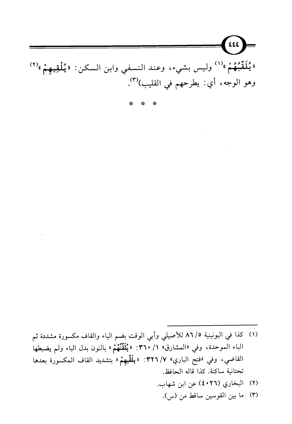 (¬1) كذا في اليونينية 5/ 86 للأصيلي وأبي الوقت بضم الياء والقاف مكسورة مشددة ثم الباء الموحدة، وفي "المشارق" 1/ 360: "يُلَقِّنُهُمْ" بالنون بدل الباء ولم يضبطها القاضي، وفي "فتح الباري" 7/ 326: "يلَقِّيهِمْ" بتشديد القاف المكسورة بعدها تحتانية ساكنة. كذا قاله الحافظ.