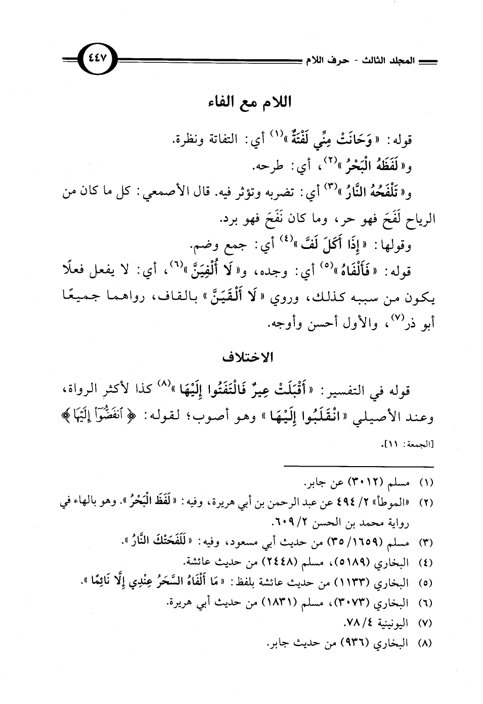و"تَلْفَحُهُ النَّارُ" (¬3) أي: تضربه وتؤثر فيه. قال الأصمعي: كل ما كان من الرياح لَفَحَ فهو حر، وما كان نَفَحَ فهو برد.