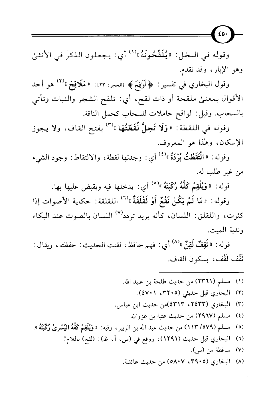 وقول البخاري في تفسير: {لَوَاقِحَ} [الحجر: 22]: "مَلَاقِحَ" (¬2) هو أحد الأقوال بمعنى ملقحة أو ذات لقح، أي: تلقح الشجر والنبات وتأتي بالسحاب. وقيل: لواقح حاملات للسحاب كحمل الناقة.