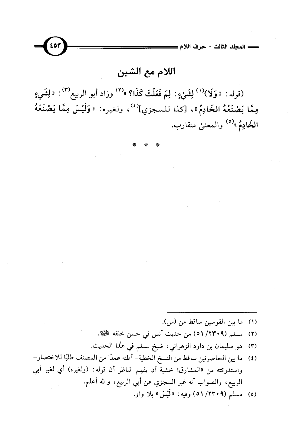 (قوله: "وَلَا) (¬1) لِشَيْءٍ: لِمَ فَعَلْتَ كَذَا؟ " (¬2) وزاد أبو الربيع (¬3): "لِشَيءٍ مِمَّا يَصْنَعُهُ الخَادِمُ"، [كذا للسجزي]، (¬4)، ولغيره: "وَلَيْسَ مِمَّا يَصْنَعُهُ الخَادِمُ" (¬5) والمعنى متقارب.