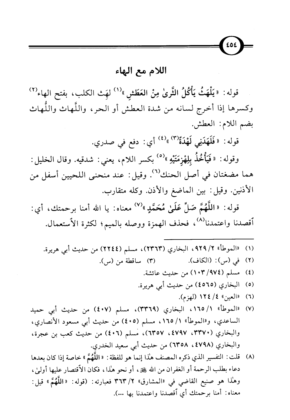 (¬8) قلت: التفسير الذي ذكره المصنف هذا إنما هو للفظة: "اللَّهُمَّ" خاصة إذا كان بعدها دعاء بطلب الرحمة أو الغفران من الله عز وجل، أو نحو هذا، فكان الاقتصار عليها أولى، وهذا هو صنيع القاضي في "المشارق" 2/ 363 فعبارته: (قوله: "اللَّهُمَّ" قيل: معناه: أمنا برحمتك أي اقصدنا واعتمدنا بها ...).