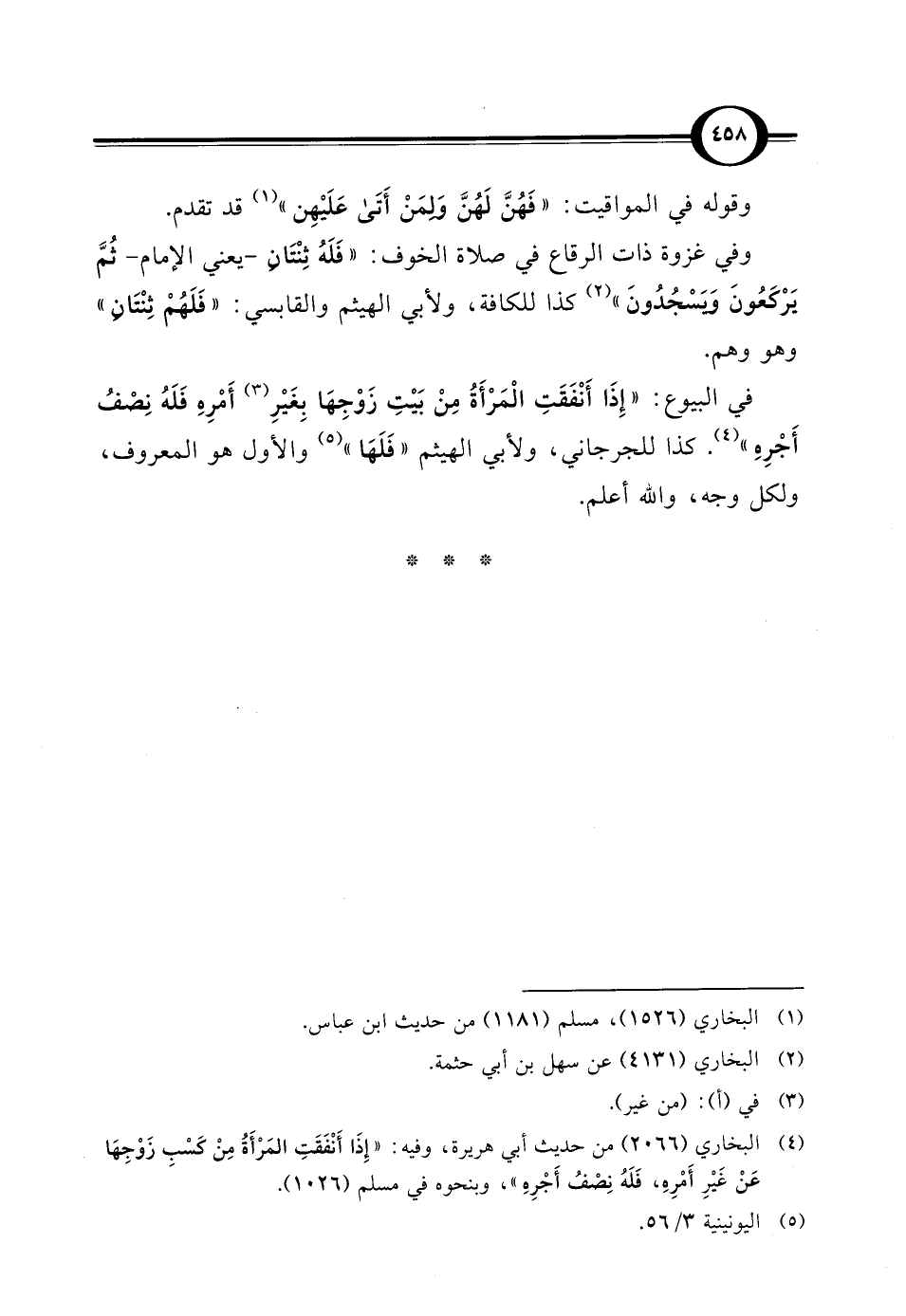 وقوله في المواقيت: "فَهُنَّ لَهُنَّ وَلِمَنْ أَتَى عَلَيْهِن" (¬1) قد تقدم. وفي غزوة ذات الرقاع في صلاة الخوف: "فَلَهُ ثِنْتَانِ - يعني الإمام - ثُمَّ يَرْكَعُونَ وَيَسْجُدُونَ" (¬2) كذا للكافة، ولأبي الهيثم والقابسي: "فَلَهُمْ ثِنْتَانِ" وهو وهم.