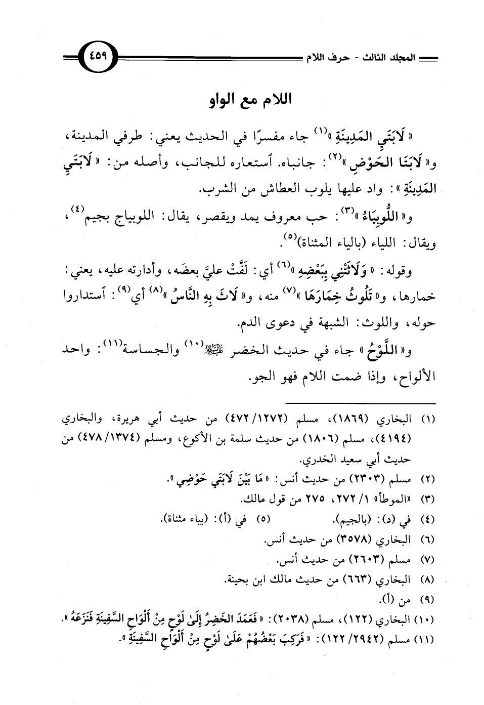 " لَابَتَيِ المَدِينَةِ" (¬1) جاء مفسرًا في الحديث يعني: طرفي المدينة، و"لَابَتَا الحَوْضِ" (¬2): جانباه. استعاره للجانب، وأصله من: "لَابَتَيِ المَدِينَةِ": واد عليها يلوب العطاش من الشرب.