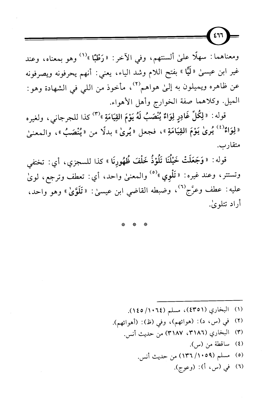 ومعناهما: سهلًا على ألسنتهم، وفي الآخر: " رَطْبًا " (¬1) وهو بمعناه، وعند غير ابن عيسى " لَيًّا " بفتح اللام وشد الياء، يعني: أنهم يحرفونه ويصرفونه عن ظاهره ويميلون به إلى هواهم (¬2)، مأخوذ من اللي في الشهادة وهو: الميل. وكلاهما صفة الخوارج وأهل الأهواء.
